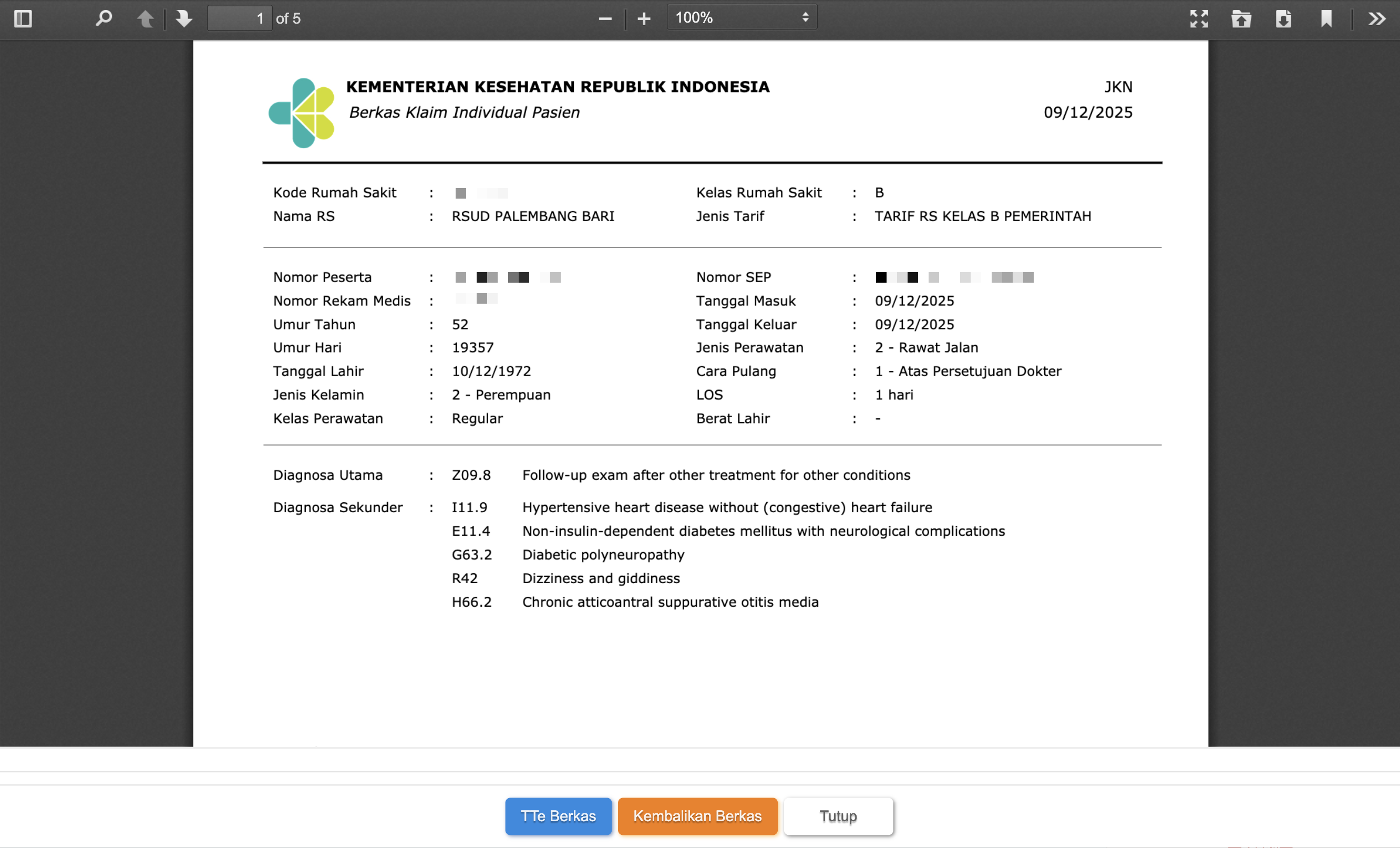 Selanjutnya akan tampil seluruh halaman berkas klaim dalam format PDF. Di bagian bawah terdapat tiga tombol. Klik Kembalikan Berkas jika Anda tidak setuju, dan klik TTE Berkas jika Anda menyetujui berkas tersebut.